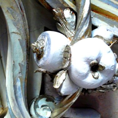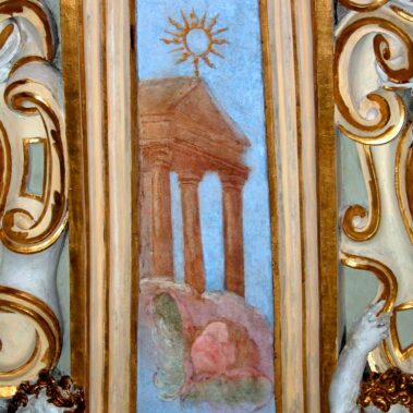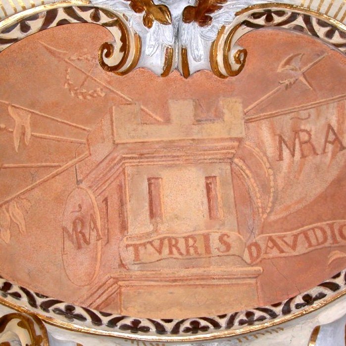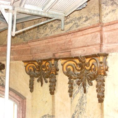 Červený umělý mramor byl užit v obloucích a na parapetech oken. Materiál se před restaurátorským zásahem vyznačoval drobnými trhlinami. Poškození bylo zatmelováno, plocha zpevněna a ošetřena speciálními přípravky a na závěr přeleštěna.
