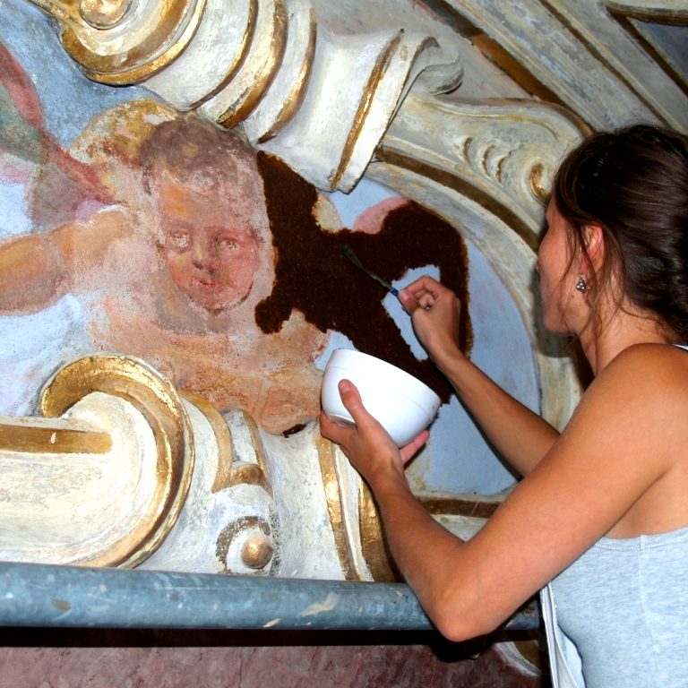 Povrch malby byl nejprve mechanicky očištěn za použití destilované vody, kaučukové či speciální houby určené k suchému čištění fresek. Zpráškovatělé části byly prekonsolidovány vodnou akrylátovou disperzí přes japonský papír. U jiných částí výmalby byla potřeba několikrát opakovaná konsolidace vodnou akrylátovou disperzí.
