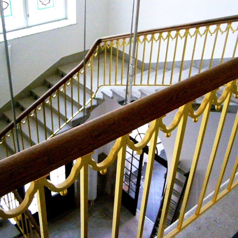 Také železné zábradlí centrálního schodiště vily bylo pokryto celkem sedmi vrstvami barevných nátěrů. Původně bylo zábradlí pokryto pravým plátkovým zlatem, to se však v minulosti přetřelo černou barvou. Kovové profily zábradlí byly shledány v zachovalém stavu a bez koroze. Metoda čištění byla shodná jako v případě zábradlí na balkonech: tryskáním ocelovou drtí. Na závěr se provedlo zlacení 24 karátovým plátkovým zlatem na podkladový mixtion.
