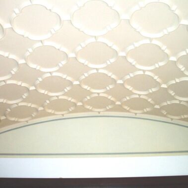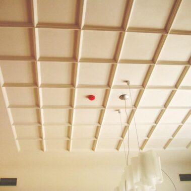 Dubový kazetový strop je tvořen čtverci s profilovanými lištami. Jednotlivé čtvercové kazety jsou vyplněny sádrovou omítkou. Celý strop byl původně po celém obvodu lemován dřevěnou římsou. Jednotlivé profilované lišty byly na několika místech popraskané, římsa dokonce částečně chyběla. Proto se přistoupilo k jejímu doplnění identickým dubovým dřevem. Popraskané lišty se slepily. Jednotlivé dřevěné prvky byly poté namořeny a nalakovány barevně odpovídajícím lakem. Taktéž sádrové výplně jednotlivých kazet byly restaurovány. Povrch se vytmelil, přebrousil a poté zahladil.