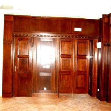 Dřevěný obklad stěn byl taktéž nejprve demontován. Pak následovalo odstranění svrchního nátěru pomocí škrabek a jemných brusek. Uvolněné části dřevěné dýhy byly podlepeny. V případě silného poškození se nechaly zhotovit dýhy nové.