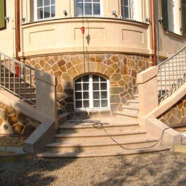 Restaurování kamenných prvků exteriéru se týkalo: soklu fasády, schodiště hlavního vstupu, schodiště spojující jednotlivé terasy a kamenných sloupků zábradlí u teras a schodiště.