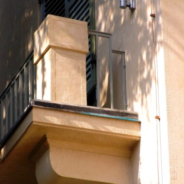 Železné zábradlí na balkonech bylo pokryto silnou vrstvou barevných nátěrů, celkem dvanácti! Povrch byl tímto zcela degradován a místy zkorodovaný. Po demontáži se přistoupilo k očištění metodou tryskání ocelovou drtí. Zkorodované části se nahradily novými. Povrch byl na závěr opatřen zinkovou vrstvou, následně základní barvou a svrchní syntetickou barvou.