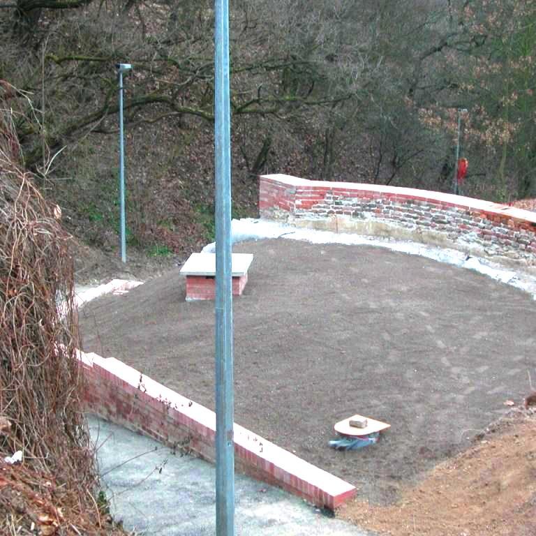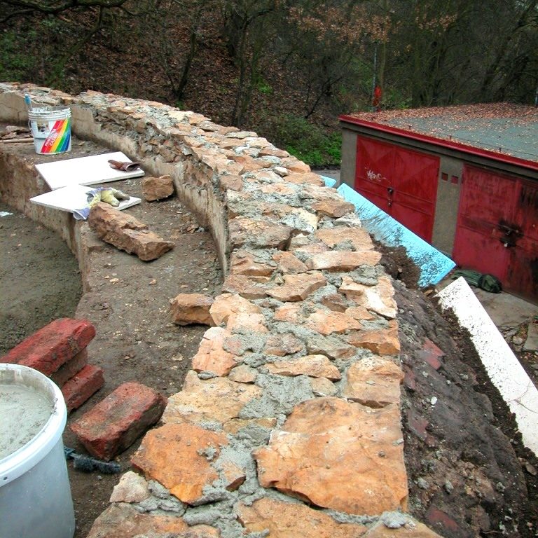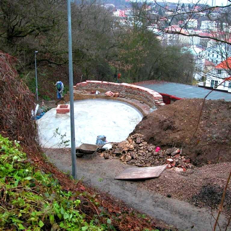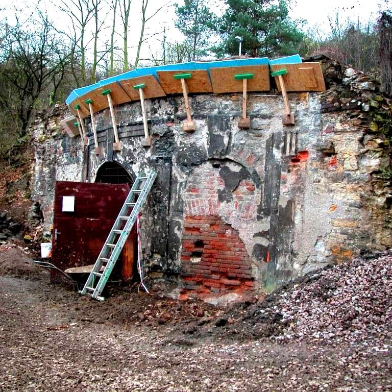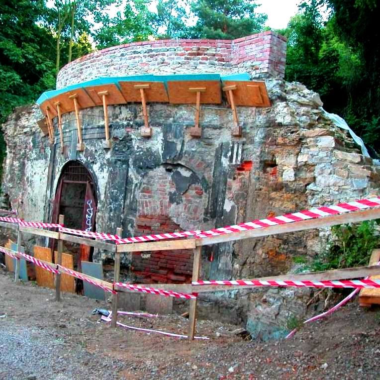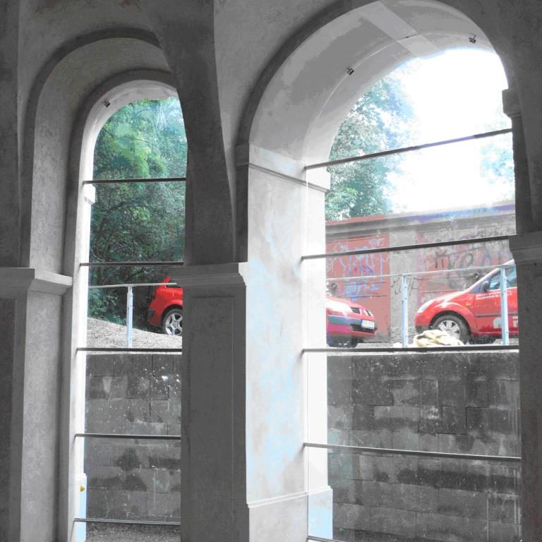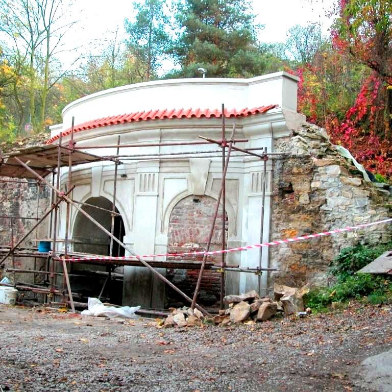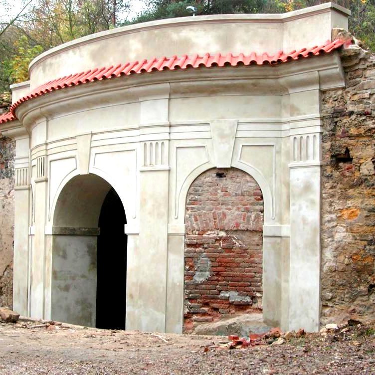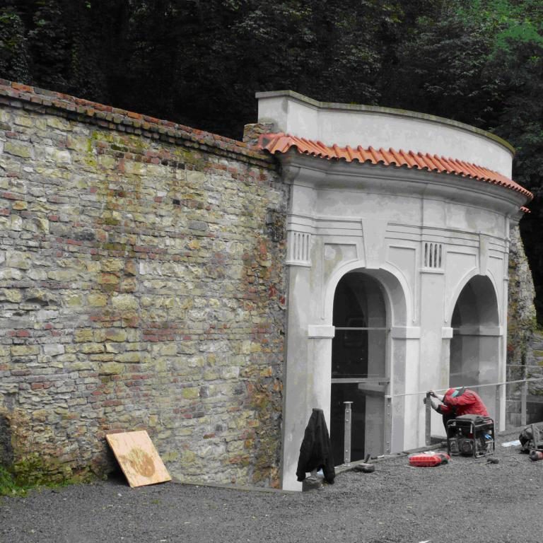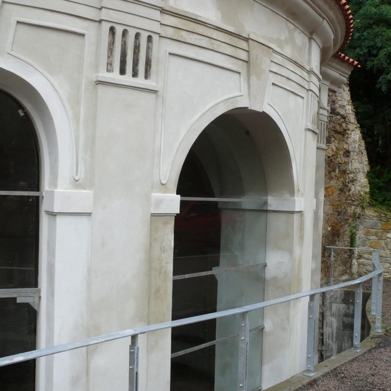 As can be clearly seen in the photo documentation compiled prior to any building intervention, Sala Terrena Na Popelce had been left in a critical state, with parts of the structure actually in ruin. The fact that a two storey garage had been built in front of the Sala Terrena in the past represented an additional set of problems. During the construction of the garage the surrounding ground was built up and the Baroque Sala Terrena became a sort of semi-basement with a limited stair access via the small English court. Building and restoration work were divided into several stages. Firstly it was necessary to ensure the structural stability of the building and then the floor was returned to its original level. The experts also found that the problem of rising damp from the substrata and the resulting damage to the stucco and the plastering was difficult to solve. They had to install internal drainage and connect it to the outside inlet at the entrance. The conservationists endeavoured to preserve the original 18th century appearance of the building. The architectonic division of the façade by pilasters and a ledge was renewed and the brick backing of the attic restored. As part of the last stage of the work the building was enclosed by fitted glass inserts in the openings. The brick flooring was also renovated, a railing in front of the small English court was installed and an outside gravel access road was laid.