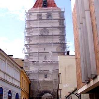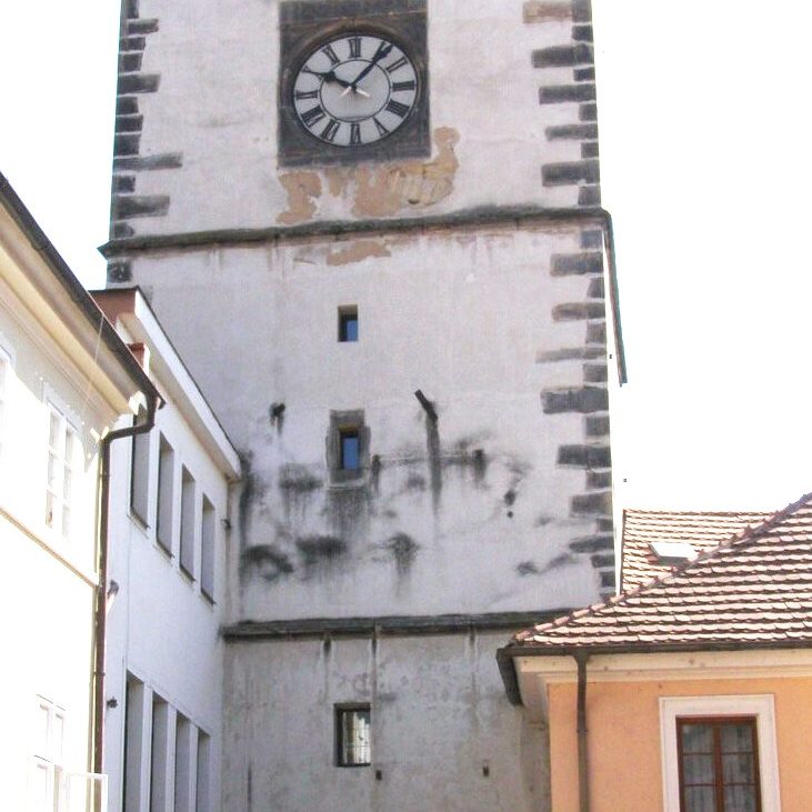 The restoration work comprised of renovation of the stone escutcheons of the windows and the tower clock face, the raking geison ledge, two of the keyhole loopholes and the reinforced quoin. Some stone elements were found to be in a state of advanced degradation. Worst damaged were the ledges on the north and west side of the Prague Gate, which had deteriorated to such a degree that it was decided to carry out partial replacement by copies made of Hořice sandstone. All stone parts were covered by layers of dirt and growths of mosses and lichens. The dirt was removed using a steam jet, and the vegetative matter by application of biocides. Subsequently the stone was treated with an organo-siliceous consolidant. More extensive fissures were sealed with a special solution. Unsuitable pointing was replaced by high quality breathable lime mortar.