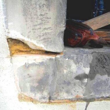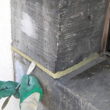 Rough argillite masonry was rid of dirt and non-original additions. The cracks were in-filled using lime mortar with added ferrous pigments.