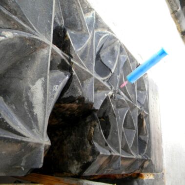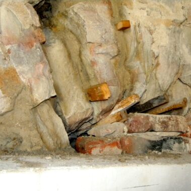The niche located on the forth level was found to have loose stone work. The experts first removed the individual blocks, cleaned them and then reset them using hydraulic lime mortar.