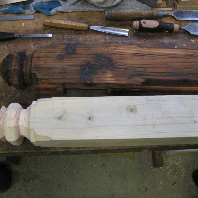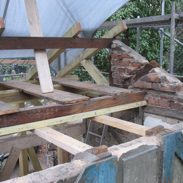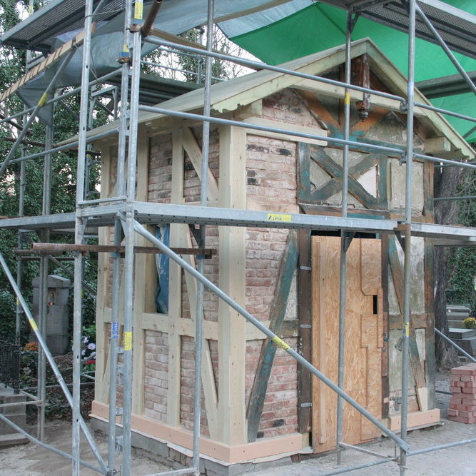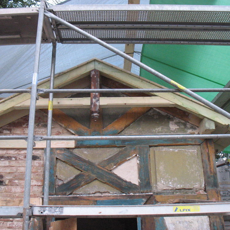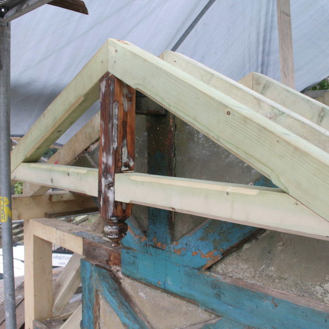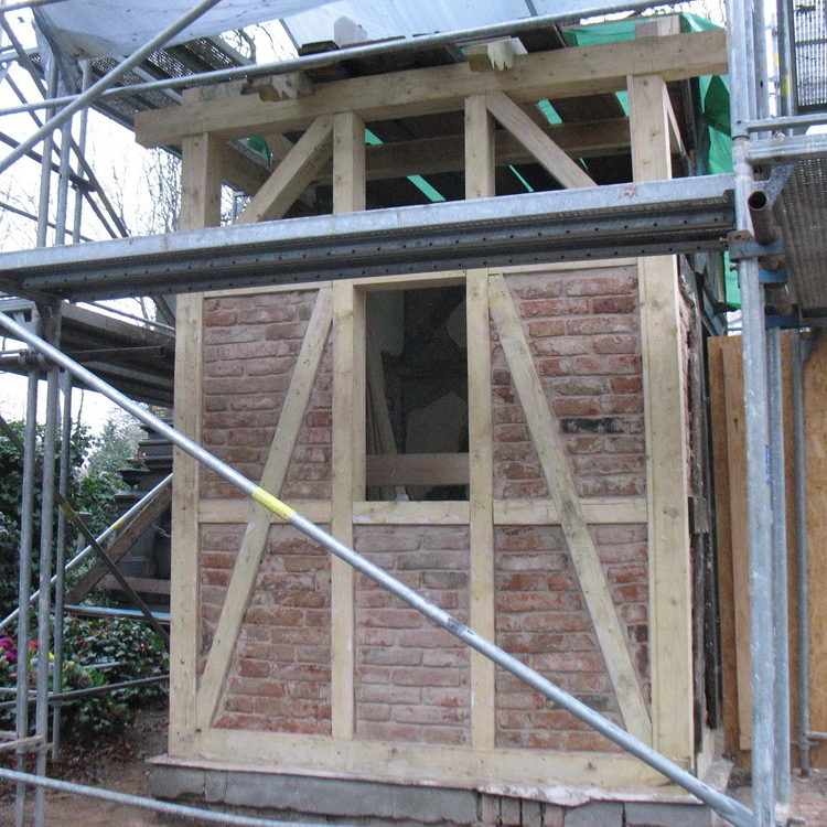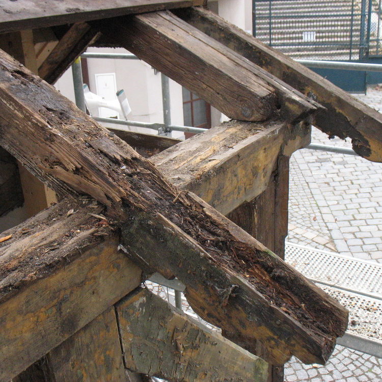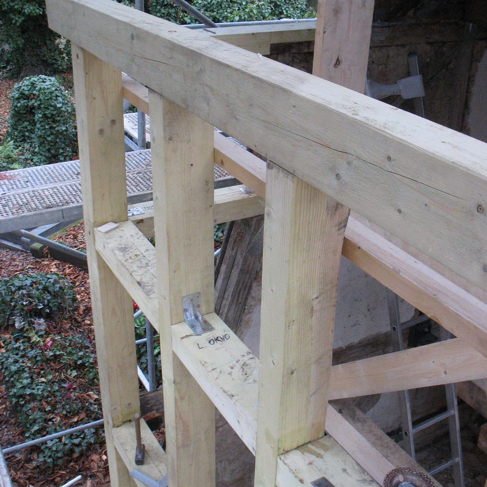 Rozsáhlé práce byly započaty zpevněním vnitřní trámové nosné konstrukce, západní část byla natolik destruována, že bylo nutno přistoupit k celkové výměně. Podle zbytků dochovaných částí se zhotovilo nové roubení ze smrkových trámů.