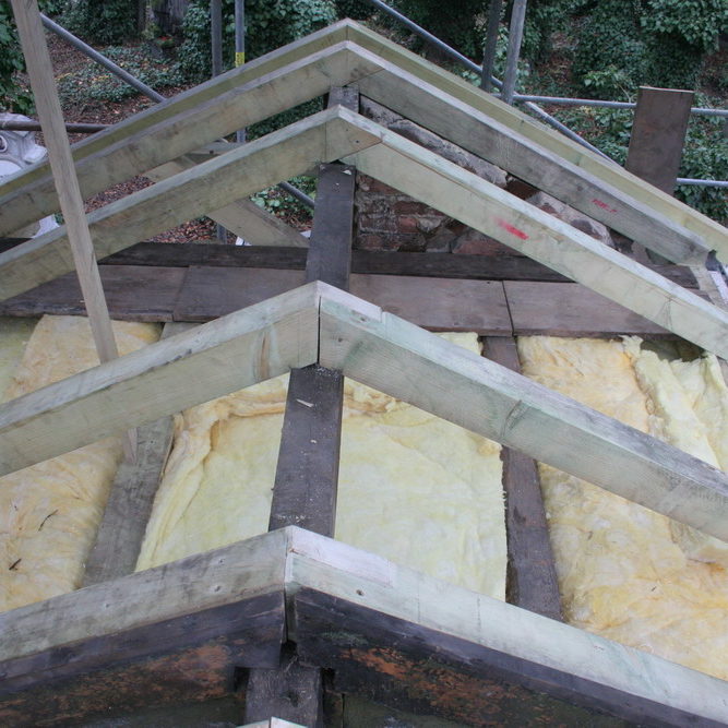 Dům byl kompletně hydroizolován, aby nedocházelo k opakovanému zavlhčení celého objektu. Také střešní krytina se dočkala obnovy – po demontáži zbytků destruované střechy, byla provedena výměna stropních trámů, dosazeny kopie krokví a vazných křížů. Následovala pokládka samotné krytiny.