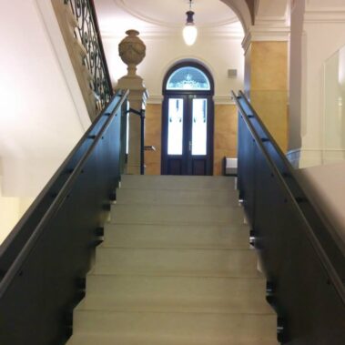 Stěny schodiště byly malovány béžovým odstínem s výrazně světlým žilkováním. Původní technologie je stejná jako u maleb na chodbách a vstupní hale, povrch však nesl silnou vrstvu ztmavlého nepůvodního laku, který byl vlivem času zkrakelovaný a silně degradovaný. Vrstva laku tak musela být nejprve mechanicky sňata, následovalo tmelení, opatření politurou a leštění.