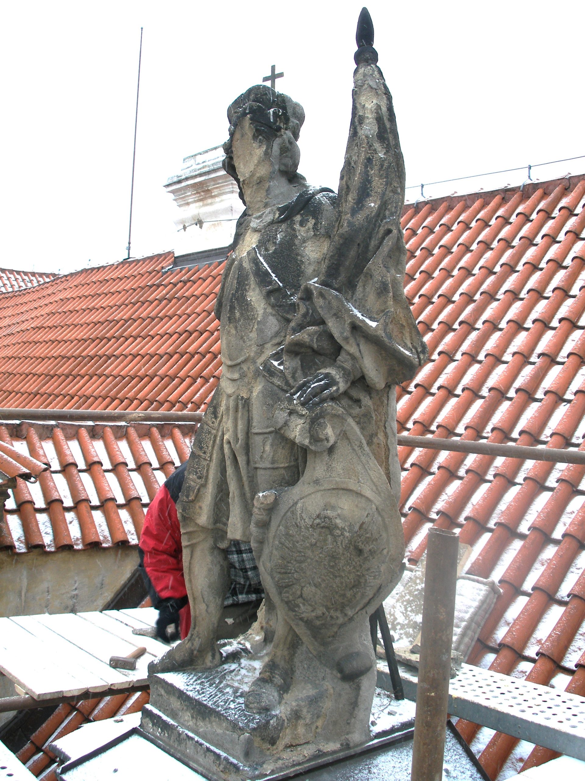 Narušený kámen u originálních soch sv. Václava a Nejsvětějšího Salvátora byl konsolidován organokřemičitany, nevhodné zkorodované čepy se nahradily novými. Zrestaurované sochy byly určeny k uložení do lapidária, kde na ně nebudou působit povětrnostní vlivy. Dle originálů odborníci následně zhotovily repliky, které byly instalovány zpět na atiku budovy.