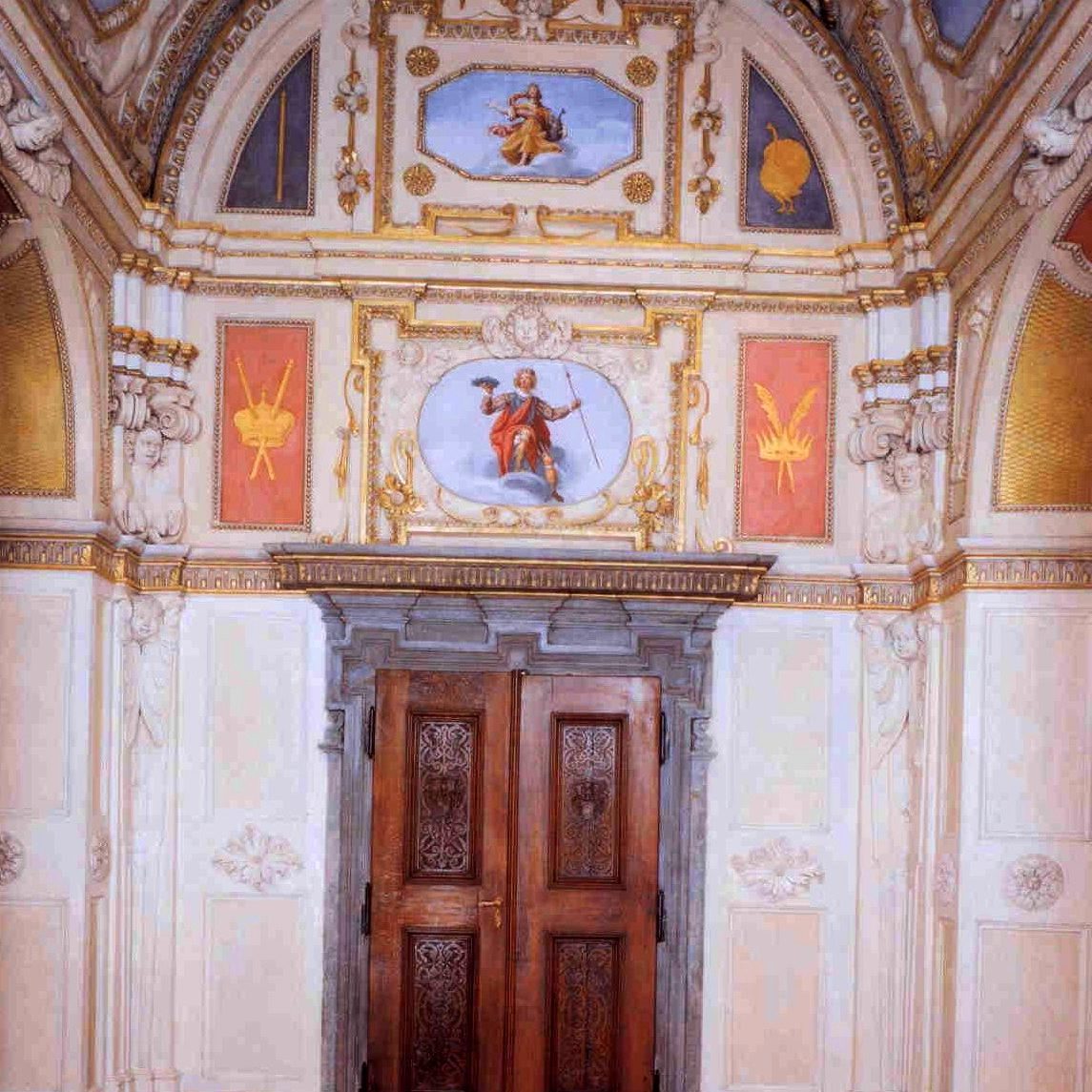 Výzdoba paláce byla inspirována severoitalskými vlivy. Typickým znakem je ornamentálně rozvíjený štuk, který rámuje místa k nástěnné malbě. Ikonografie sledovala celkem čtyři námětové roviny, a to válečnou, náboženskou, antickou mytologii a astrologii. Autorem většiny maleb byl Bartolomeo Baccio del Bianco (1604 – 1656), štukovou výzdobu provedli Domenico Canevalle a Santino Galli. Umělecké řezby v kapli sv. Václava vytvořil Arnošt Jan Heidelberg, dvorní řezbář císaře Ferdinanda II.