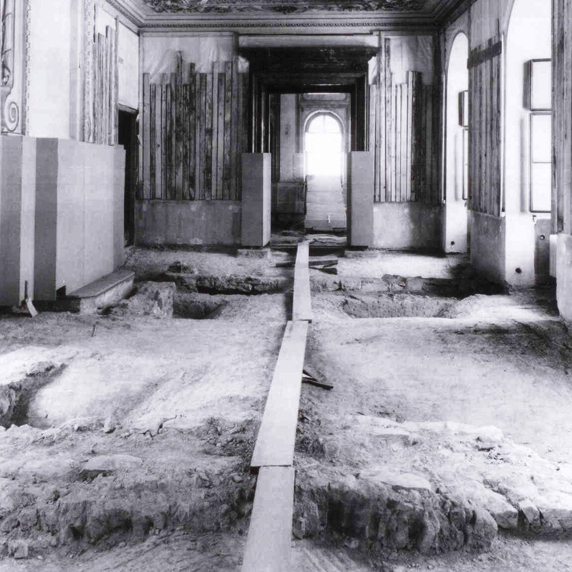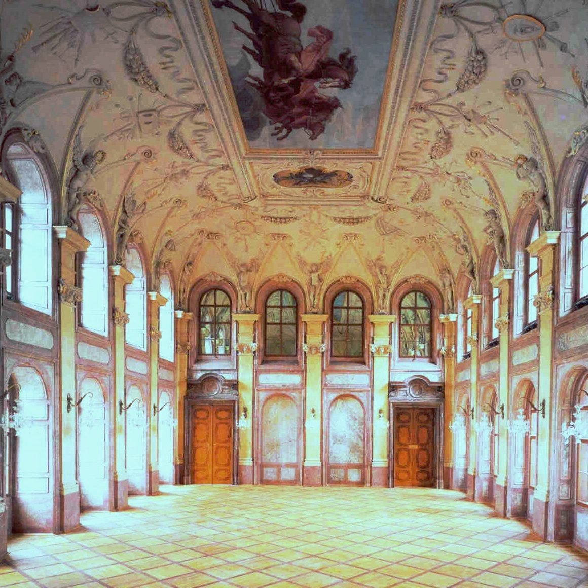 Odlišné materiály byly užity během restaurování štukové vrstvy z 19. století, které se svým složením liší od výzdoby starší. Tyto štuky byly též do značné míry narušeny vlivem havárie prasklého potrubí ústředního vytápění paláce. Úpravy se tak odvíjely od zjištění původní podoby dekorace. Konzervace se prováděly ředěnou fermeží, tzv. šperkou.